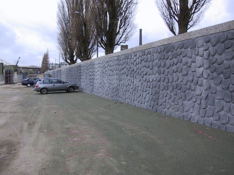 V holandskom Arnheime bolo treba znova vybudovať 500 m nábrežného múru. Problémom nebol samotný múr, ale želaný povrch betónu podobný prírodnému kameňu. Špecialisti z NOE vložili do zvlášť na tento účel upraveného debnenia pravé bazaltové kamene vyškárované epoxidovou živicou a vytvorili predlohu pre vytvorenie matrice. Matricu vyliali tekutým NOEplast-om a z odliatku vytvorili negatív pre výrobu 8 rohoží NOEplast-u rozmerov 2515 x 2760 mm. Tu bol ešte použitý starý typ tekutého NOEplast-u červenej farby, dnes sa používa šedý.